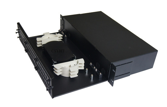 Rack mounted fiber optic patch panel is used in 19 inch cabinet for fiber connection, distribution and protection. Drawer Rack-mount Fiber Optic Distribution Frame has cold steel sliding fittings with self-locking functions prevent the drawer from falling when moved; 19-inch rack mount for ST, SC, LC,, FC adapters. The drawer is the holding board for splicing, easy to withdraw the fibers when testing and distributing..